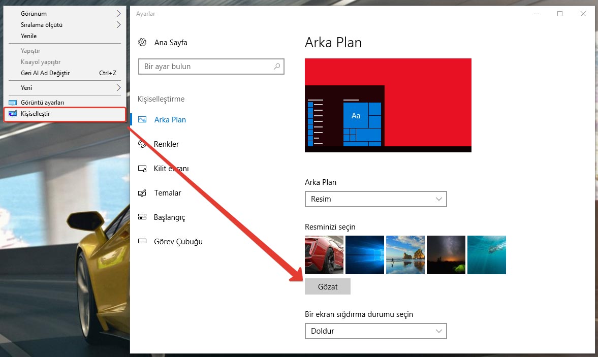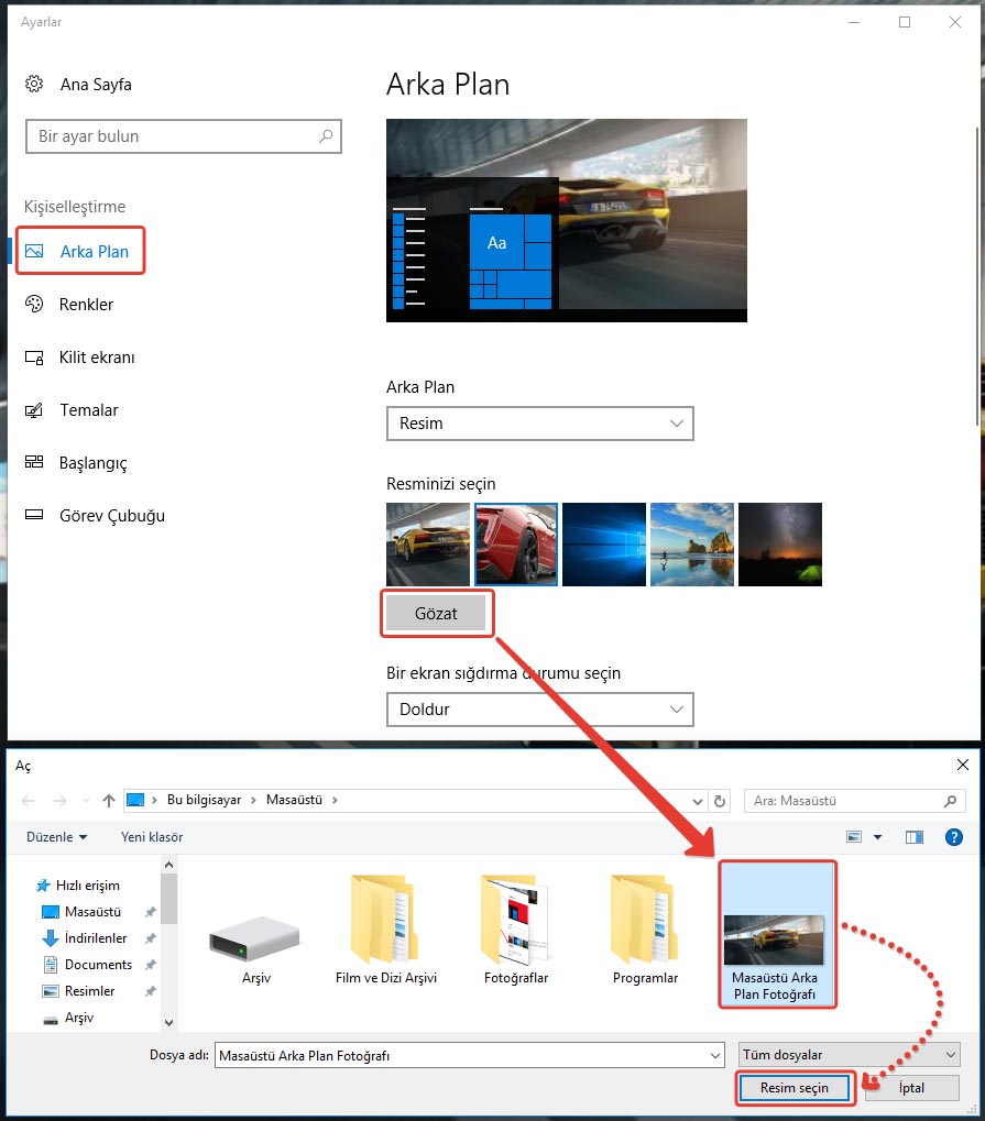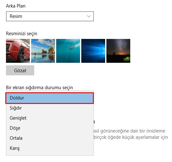Açılan pencerede hazır fotoğraflardan seçeceğiniz gibi GÖZAT kısmından kendi indirdiğiniz veya bilgisayarınızda bulunan fotoğraflardan birini seçebilirsiniz. GÖZAT dedikten sonra resmi seçtiğinizde otomatik arka planda görünecektir. Dilerseniz masaüstüne aldığınız bu fotoğrafı başka bir yere taşıyabilir veya silebilirsiniz. Masaüstü ekranı aynen kalacaktır.