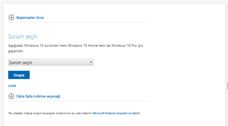 (Bu işlemleri yapmadan açılan pencereden Windows 10‘u indirirseniz sadece Home sürümünü indirmiş olacaksınız. Ancak burada bizim yöntemimizde yukarıda saydığımız sürümler paket içerisinde yer alacaktır.)