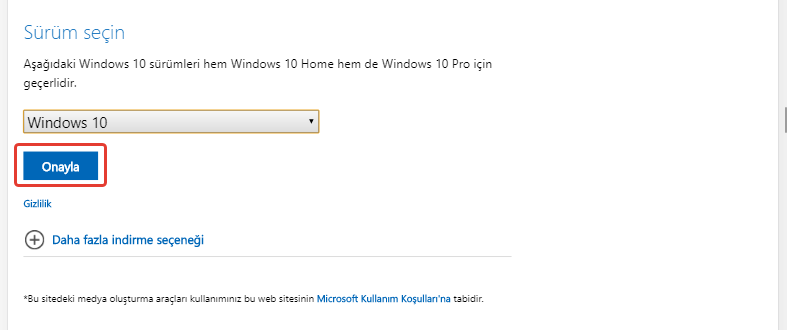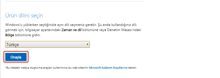5- Burada ise indirmek istediğiniz Windows 10‘un dilini seçip “Onayla” diyoruz. Türkçe olarak seçip “Onayla” diyelim. İşletim sistemi diliniz Türkçe olacaktır.