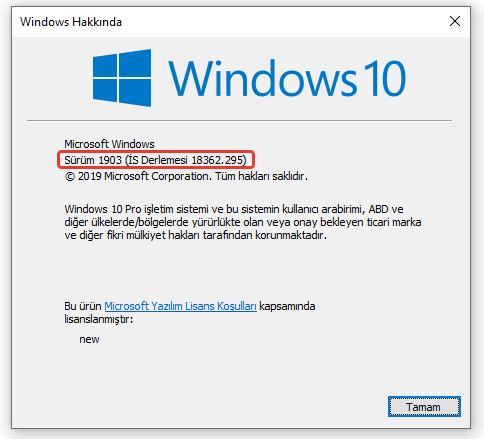 | 1903 | 19H1 | 18362 | 21 Mayıs 2019 |