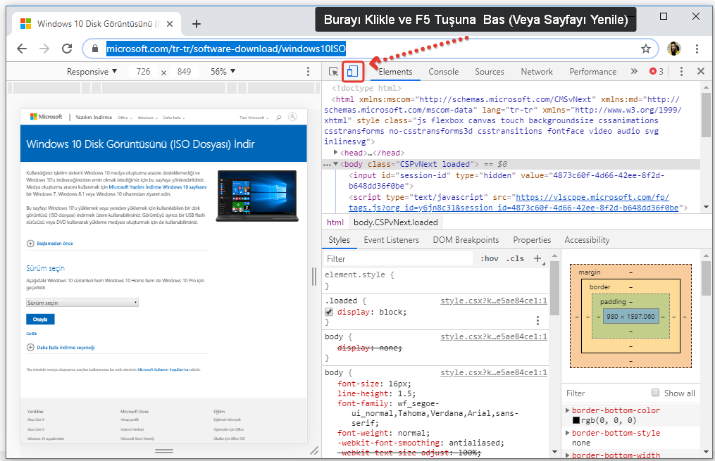 1- Öncelikle burada (tıkla) bulunan linki klikliyoruz. Bu link doğrudan sizi Microsoft’un Windows 10 indirme kısmına götürecektir. Pencere (Google Chrome’de) açıldıktan sonra klavyeden F12 tuşuna basıyoruz. Ardından sağda açılan panelden aşağıda gösterdiğim telefon/tablet simgesine klikleyip sayfayı F5 tuşuna basarak sayfayı yeniliyoruz.