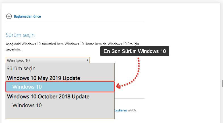 3- Şu andaki tarih itibariyle son sürüm 10 Mayıs 2019 tarihli versiyon olacaktır. Burada Windows 10 May 2019 Update kısmının hemen altında ki Windows 10 sekmesini kliyoruz.