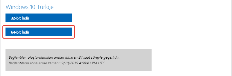 6- Son olarak “32 Bit mi yoksa 64 Bit mi” seçeneğini seçiyoruz. Bilgisayarınız 4 GB RAM ve üzerinde ise 64 Bit‘i seçmelisiniz. 64 Bit‘i kliklediğinizde işletim sistemi en son sürüm Windows 10 .ISO dosyası şeklinde (“Win10_1903_V1_Turkish_x64.iso”) bilgisayarınıza inecektir. (Yaklaşık boyutu 4.3 GB olacaktır, internet bağlantı hızınızın durumuna göre 25 dk ile 1 saat içerisinde inmiş olacaktır.)