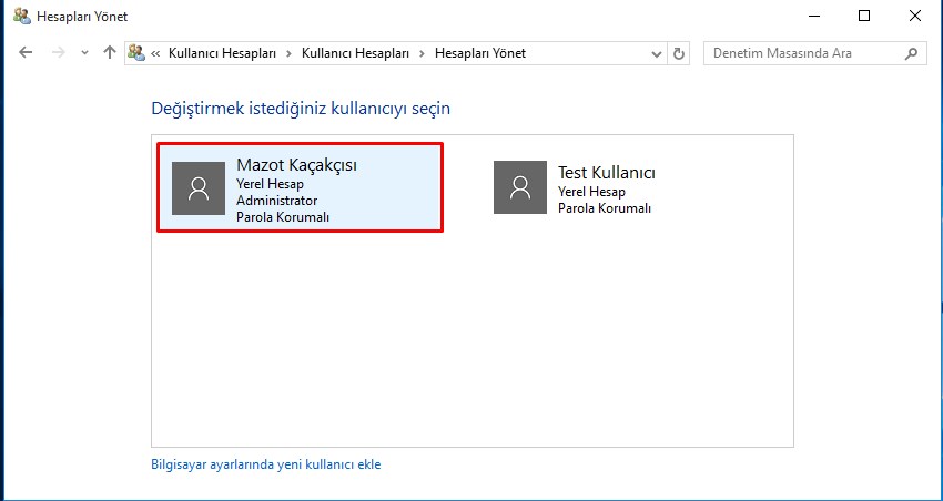 3- Eğer adminsek istediğimiz hesabın şifresini değiştirebiliriz. Admin değilsek sadece kendi hesabımızın şifresini değiştirebiliriz. Hesabımızı seçiyoruz.