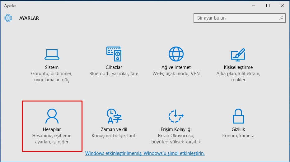 2- Açılan pencereden Hesaplar kısmını seçiyoruz.