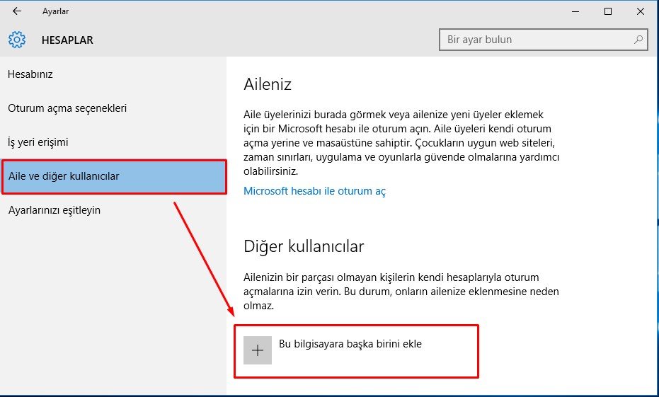 3- Bu kısımda ise Aile ve diğer kullanıcılar sekmesine geliyoruz. Bu bilgisayara başka birisini ekle diyoruz.