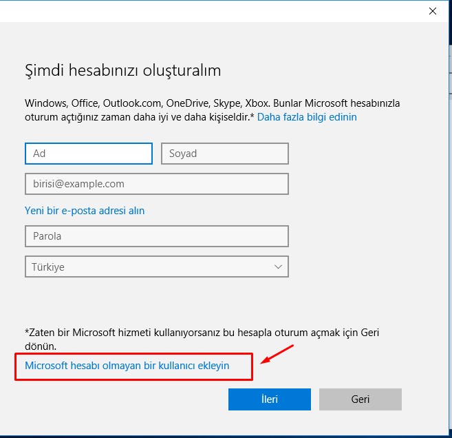 5- Bu yaptığımızda Microsoft hesabımızın olmadığını varsayarak kayıt olmamız için bir ekran geldi. Ancak biz yinede Microsoft hesabı ile değilde normal kullanıcı hesabı ile yeni kullanıcı kaydı yapmak istiyoruz. Bu nedenle Microsof hesabı olmayan bir kullanıcı ekleyin diyoruz.