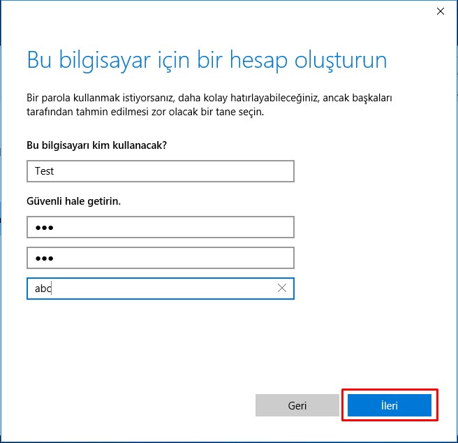 6- Bu kısımda ise kaydımıza başlıyoruz. Bu bilgisayarı kim kullanacak kısmına bir kullanıcı adı yazıyoruz. Şifresini iki kez yazıp şifre hatırlatma kısmına şifreden farklı olmak üzere hatırlatıcı bir şeyler yazıyoruz. Şifremizi unutursak lazım olacak. İleri diyoruz…