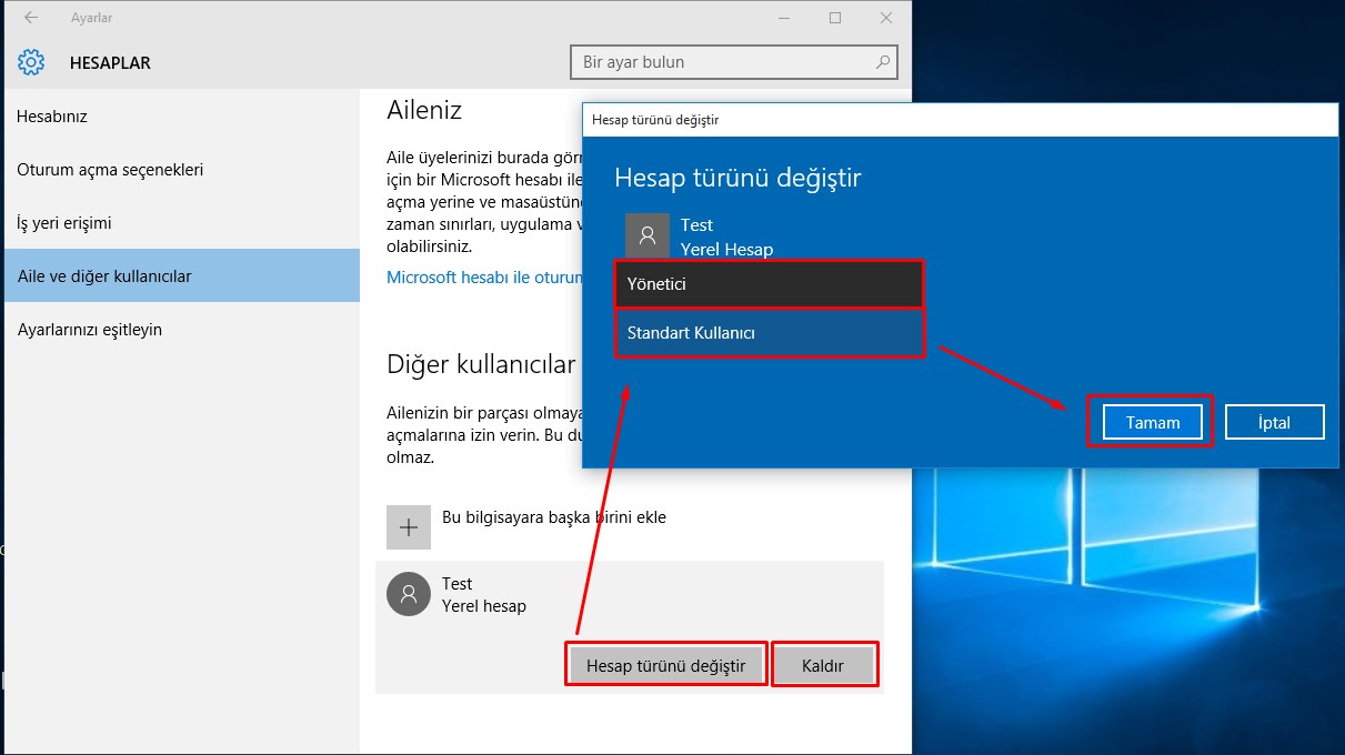 7- Kullanıcı hesabımız oluşturuldu. Dilersek kullanıcı hesabımızın üzerine klikleyerek Yönetici veya Standart kullanıcıyı belirleyebiliriz. İlk oluşturduğumuzda standart kullanıcı hesbaı olarak oluşturulur. Dilerseniz yönetici yapabilirsiniz. Hesabı silmek istiyorsanız KALDIR diyebilirsiniz.