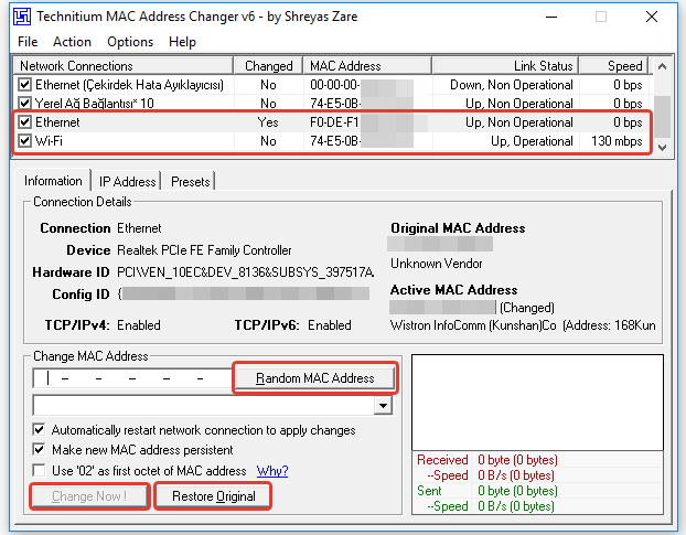 Değiştirdiğiniz MAC adreslerini orjinal yani eski haline getirmek içinse; “Restore Original” demeniz yeterlidir.