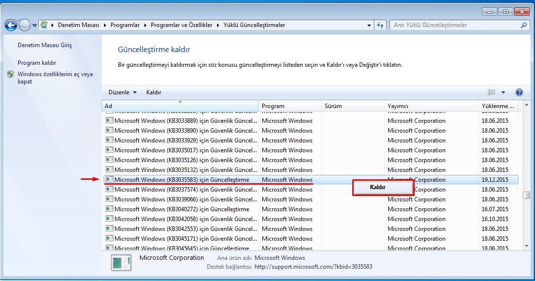 3- Microsoft Windows KB3035583 Güncellemesi üzerine gelip. Sağl klik yaparak kaldır diyelim. Bilgisayarımız yeniden başlatılacak. Bu kadar :))
