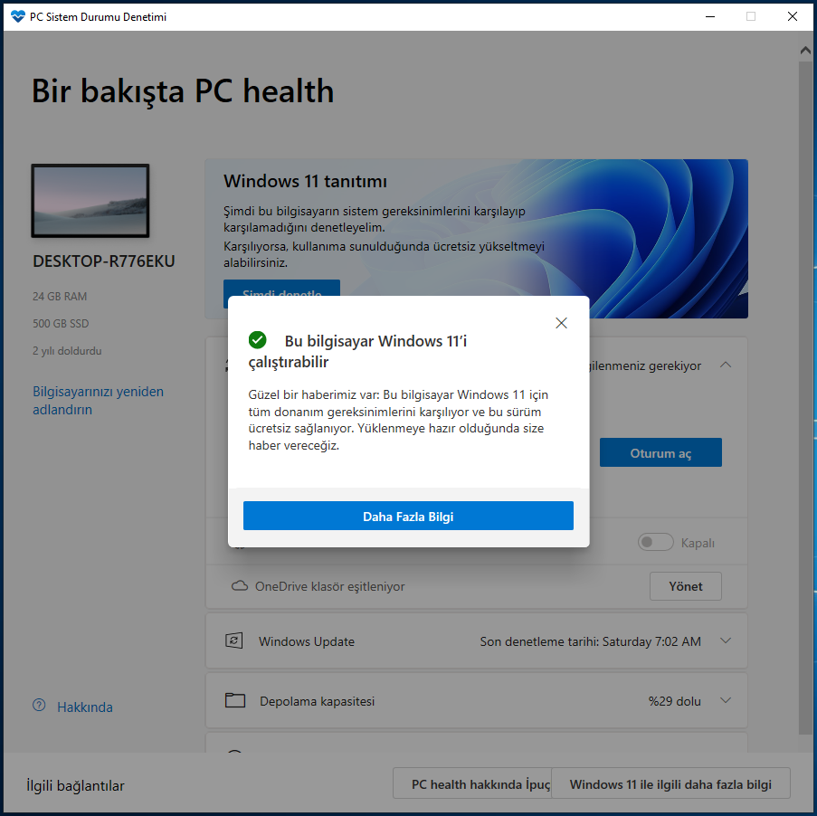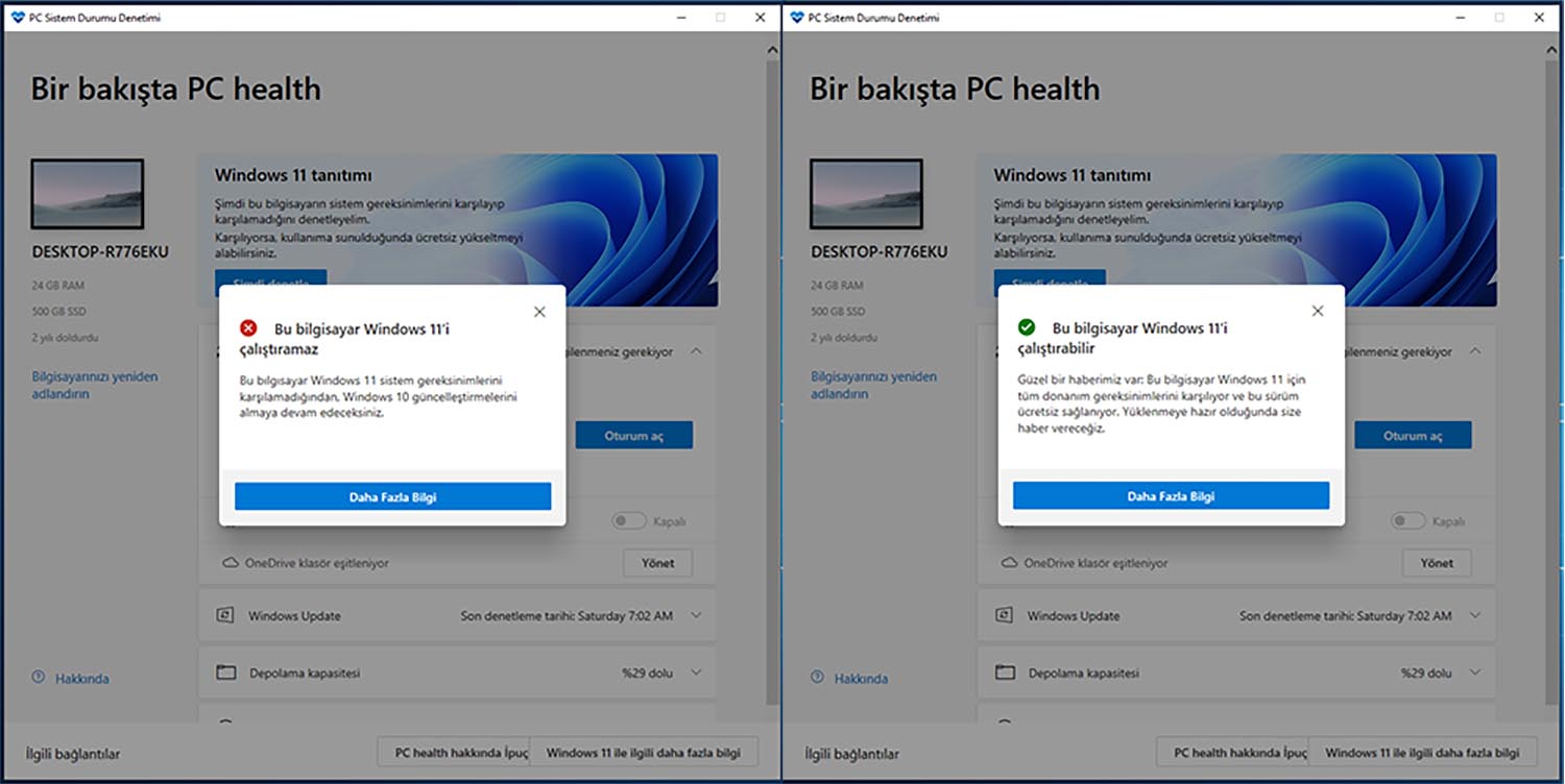 Mevcut bilgisayarınızın Windows 11 işletim sistemini çalıştırma gereksinimlerini karşılayıp karşılamadığını görmek için Bilgisayar Sistem Durumu Denetimi (tıkla) uygulamasını kullanın. Karşılıyorsa yükseltme geldiğinde ücretsiz yükseltebilirsiniz. Programı kullandığınızda aşağıdaki gibi iki bildirimden birini alacaksınız.