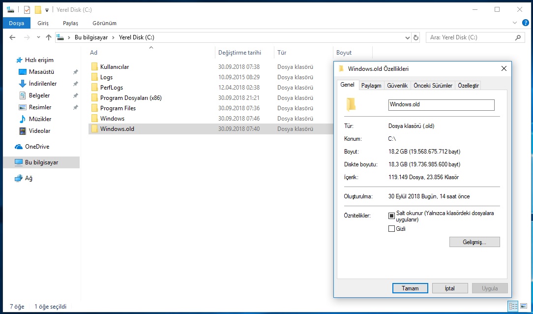 Tabi bu durum internet bağlantı hızınıza göre değişiyor. Windows 10 güncellemesini yaptıktan sonra bilgisayarımın C: Sürücüsünde Windows.old diye bir klasör oluştuğunu fark ettim. Bu klasör birçoğumuzun bildiği üzere ilk yüklemedeki -bir nevi yedek- Windows sürümü oluyor. Çöp durumdaki bu Windows.old klasörü 18GB bir alan kapladığını söyleyelim.