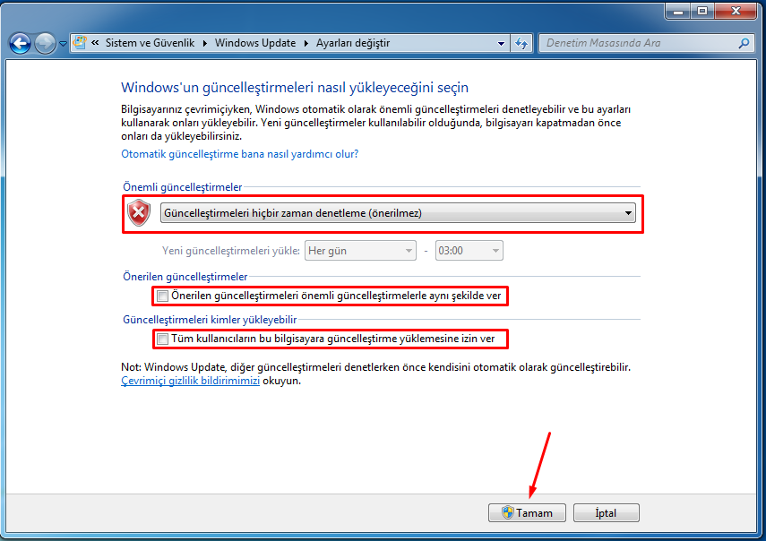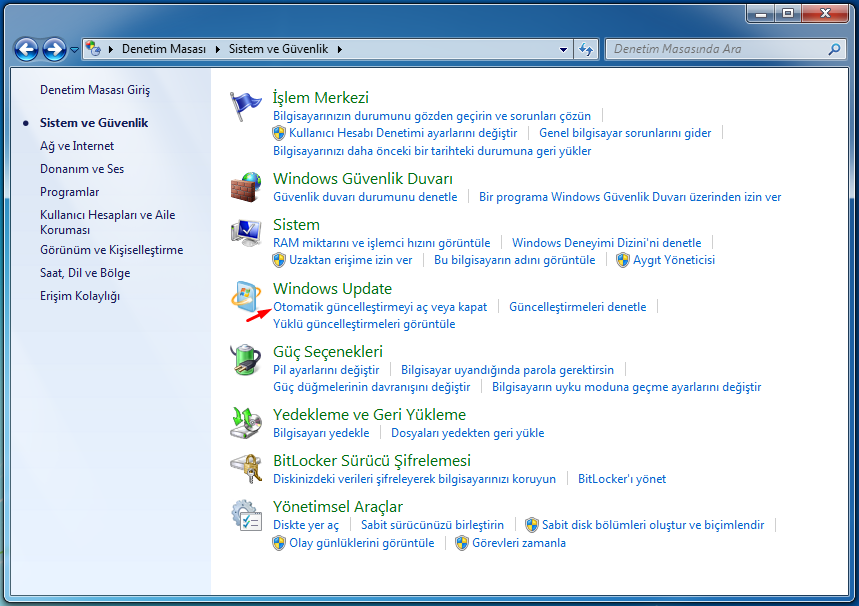 Başlat >>> Denetim Masası >>> Sistem ve Güvenlik >>> Otomatik Güncelleştirmeyi Aç veya Kapat kısmına geldiğinizde aşağıdaki gibi işlem yapınız.