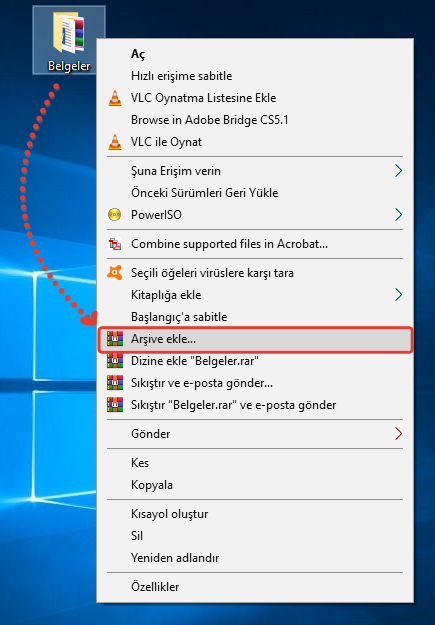 Örneğin; Masaüstünde bulunan “Belgelerim” klasörü içindeki dökümanları sıkıştırmak için üzerine sağ klikleyip arşive ekle diyoruz.