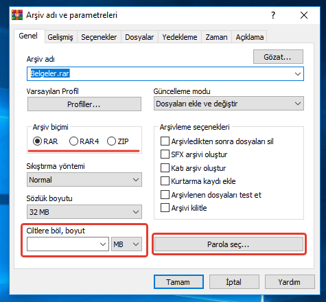 Gelen panelde “Arşiv Adını” değiştirebilirsiniz. Değiştirmeseniz otomatik olarak klasör adını verecektir. Arşiv biçimini değiştirebilirsiniz. Ancak standart olarak RAR şeklinde olması her zaman tercih nedeni olmalıdır. Eğer sıkıştıracağınız klasörün boyutu çok büyük ise ve birbirine yakın kapasitede eşit paketler halinde arşivlemek istiyorsanız Ciltlere böl, boyut kısmından dilediğiniz büyüklükte arşiv paketleri oluşturabilirsiniz. Örneğin; 20 GB bir veriniz var. Bunları 5’er GB paketler halinde bölmek istiyorsanız Ciltlere böl, boyut kısmından 5000 MB olarak seçebilirsiniz. Böylece 4 arşiv paketi oluşacaktır. Ancak arşivi açmak için 4 paketin aynı yerde bulunması zorunludur. Aksi halde arşivlediğiniz klasörü açamazsınız. Son olarak arşivinize şifre verebilirsiniz. Bu durumda şifre olmadan kimse bu arşivi açamayacaktır. Arşivlediğiniz klasör veya belgeler için şifre verdiyseniz şifreyi unutmamanız oldukça önemlidir. Şifreleme ve ciltlere bölme tamamen isteğiniz doğrultusunda vereceğiniz karardır. Normalde doğrudan hiçbir şey yapmadan arşivlemek için TAMAM demeniz yeterlidir.