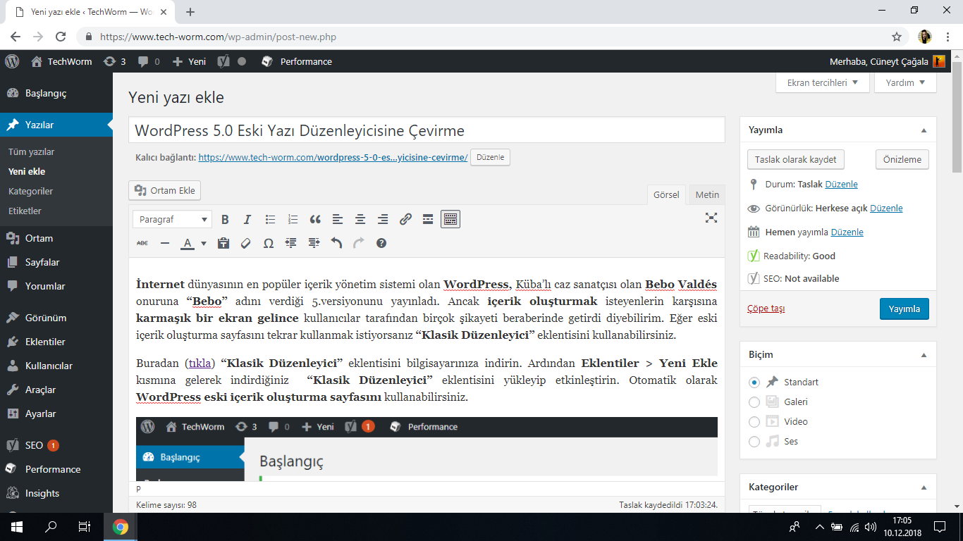 İnternet dünyasının en popüler içerik yönetim sistemi olan WordPress, Küba’lı caz sanatçısı olan Bebo Valdés onuruna “Bebo” adını verdiği 5.versiyonunu yayınladı. Ancak içerik oluşturmak isteyenlerin karşısına karmaşık bir ekran gelince kullanıcılar tarafından birçok şikayeti beraberinde getirdi diyebilirim. Eğer eski içerik oluşturma sayfasını tekrar kullanmak istiyorsanız “Klasik Düzenleyici” eklentisini kullanabilirsiniz.