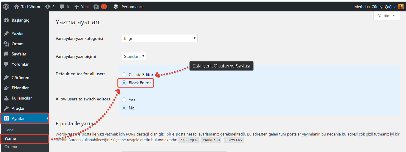 Eğer tekrar son güncel halini kullanmak isterseniz eklentiyi devre dışı bırakabilir veya admin panelde Ayarlar > Yazma kısmına gelerek Block Editor‘u seçebilirsiniz.