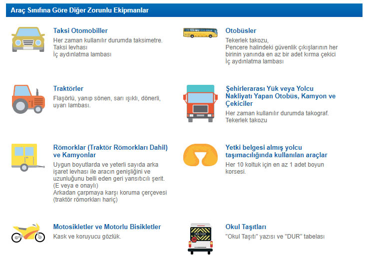 – Motosikletler ve lastik tekerlekli traktörler hariç bütün araçlar ile tarım orman römorkları da dahil olmak üzere tüm römorklarda her zaman kullanılabilir durumda bulundurulacaktır.