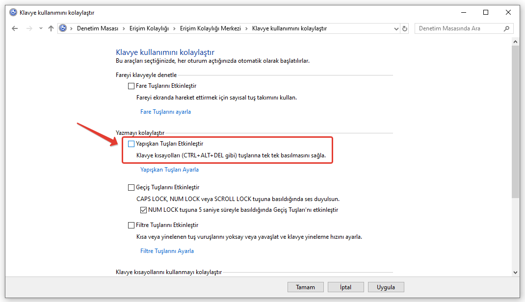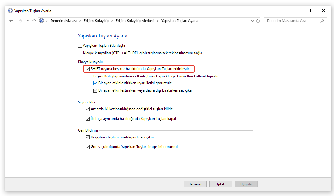 Ayrıca SHIFT tuşuna 5 kez bastığınızda uyarı çıkmasını istemiyorsanız da Yapışkan Tuşları Ayarla yazısına tıklayıp buradan “SHIFT tuşuna beş kez basıldığında yapışkan tuşları etkinleştir” ayarını devre dışı bırakabilirsiniz.