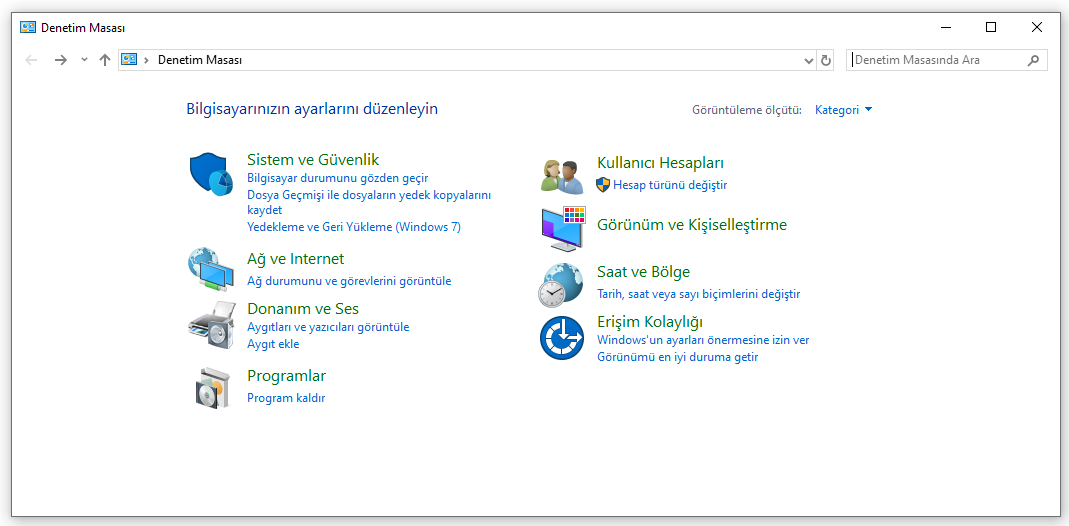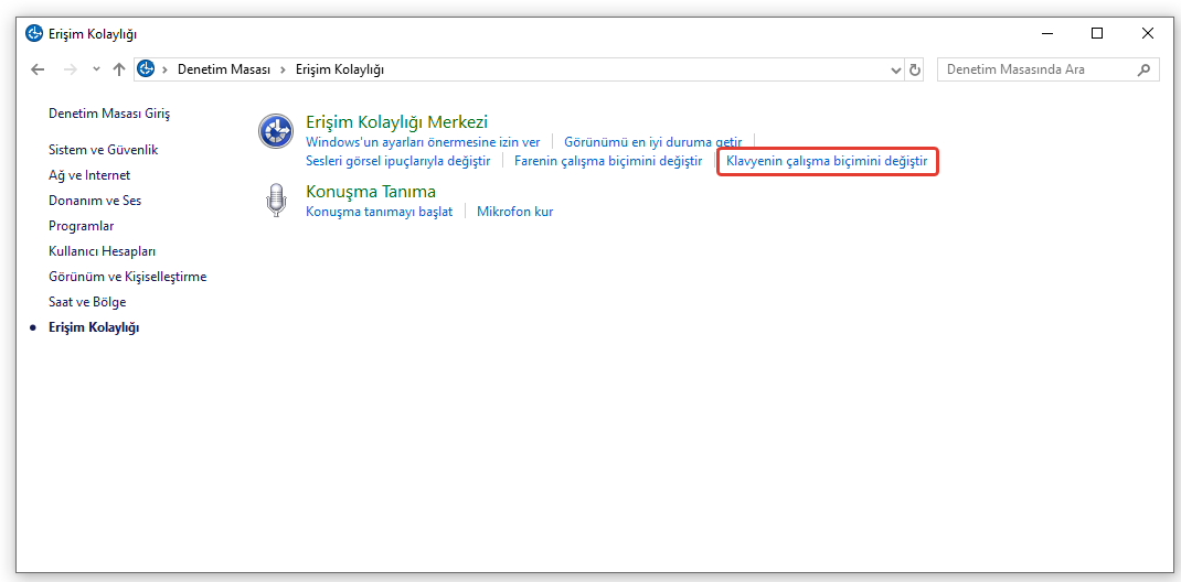 Başlat butonuna ve sonra Denetim Masası sekmesine tıklayın.(Arama kısmına Denetim Masası yazarak ulaşabilirsiniz.) Buradan Erişim Kolaylığı seçeneğine tıklayın.
