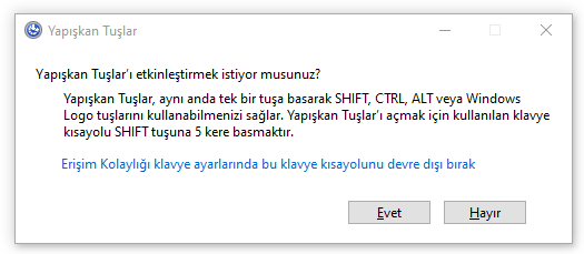 Bilgisayarınızda oyun oynarken veya bazı programları kullanırken SHIFT tuşuna üst üste 5 defa bastığınızda Windows, yapışkan tuşlar özelliğini etkinleştirmeniz için bir uyarı veriyor. Bu uyarı oyununuzu veya işinizi yarıda bölebiliyor. Peki nedir bu yapışkan tuşlar ve nasıl kapatılır?