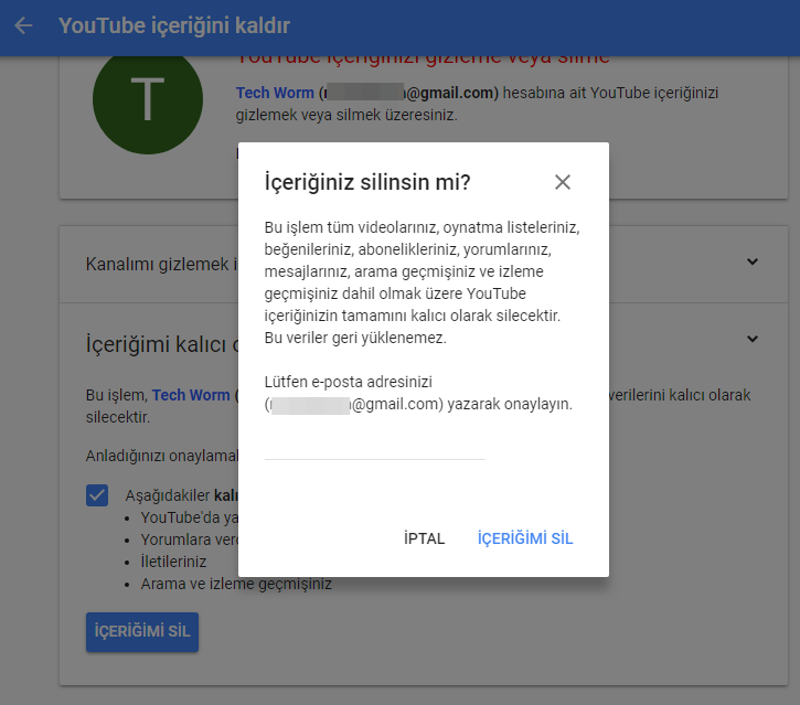 Yeniden şifrenizi girip aşağıdaki gibi E-Posta bilginizi tekrar yazdıktan sonra İÇERİĞİMİ SİL diyoruz. Youtube kanalımız kapanmıştır.