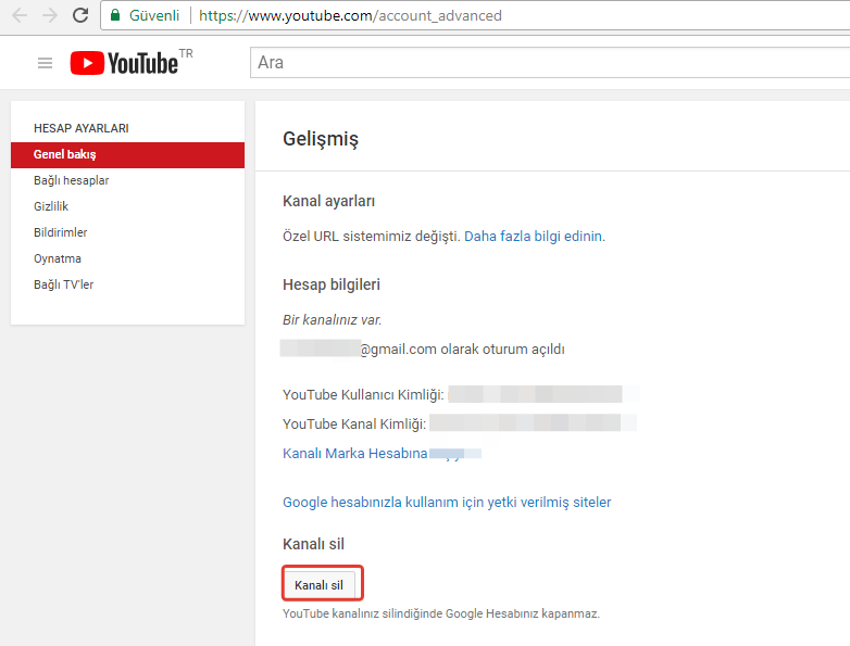 İlk olarak https://www.youtube.com/ sayfasına gidin ve giriş yapın. Profil logonuzu klikleyerek aşağıdaki gibi yuvarlak anahtar (ayarlar) simgesini klikleyin. Genel bakış sekmesinden Gelişmiş kısmını seçin.