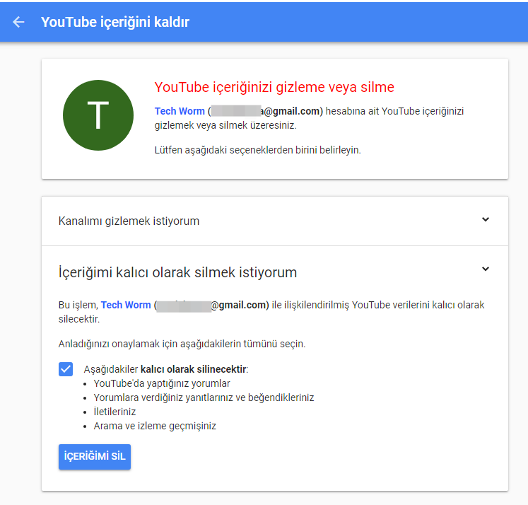 Burada karşınıza iki seçenek gelecektir. Kanalı Gizleme ve Kanalı Silme şeklinde. Kanalı Gizlemek istiyorsanız kanalı gizleme kısmını seçin yok tamamen kapatmak/silmek istiyorsanız “İçeriğimi Kalıcı Olarak Silmek İstiyorum” seçeneğini klikleyin ve “İçeriğimi Sil” deyin.