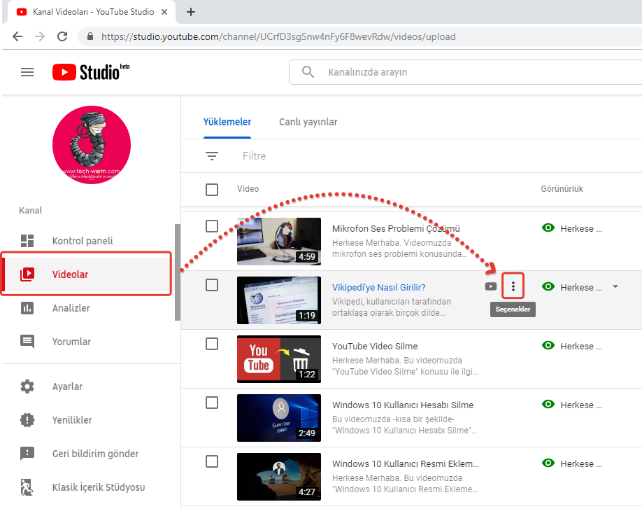 2- Açılan sol kısımdaki menüden Videolar‘ı seçin. Silmek istediğiniz videonun yanında bulunan üç nokta simgesini klikleyin.