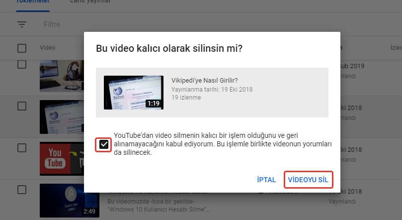 4- Bu video kalıcı olarak silinsin mi? YouTube’dan video silmenin kalıcı bir işlem olduğunu ve geri alınamayacağını kabul ediyorum. Bu işlemle birlikte videonun yorumları da silinecek, uyarısına onay verip “Videoyu Sil” dediğimizde videonuz kalıcı olarak silinecektir.