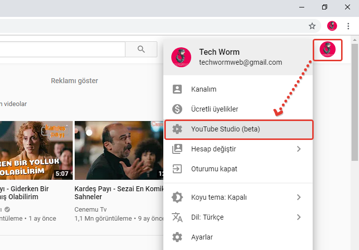 1- YouTube hesabınızla oturum açın ve sağ üst kısmında bulunan profil fotoğrafınıza veya simgenize klikleyin. Açılan pencereden YouTube Studio (beta) yazan yeri klikleyin.