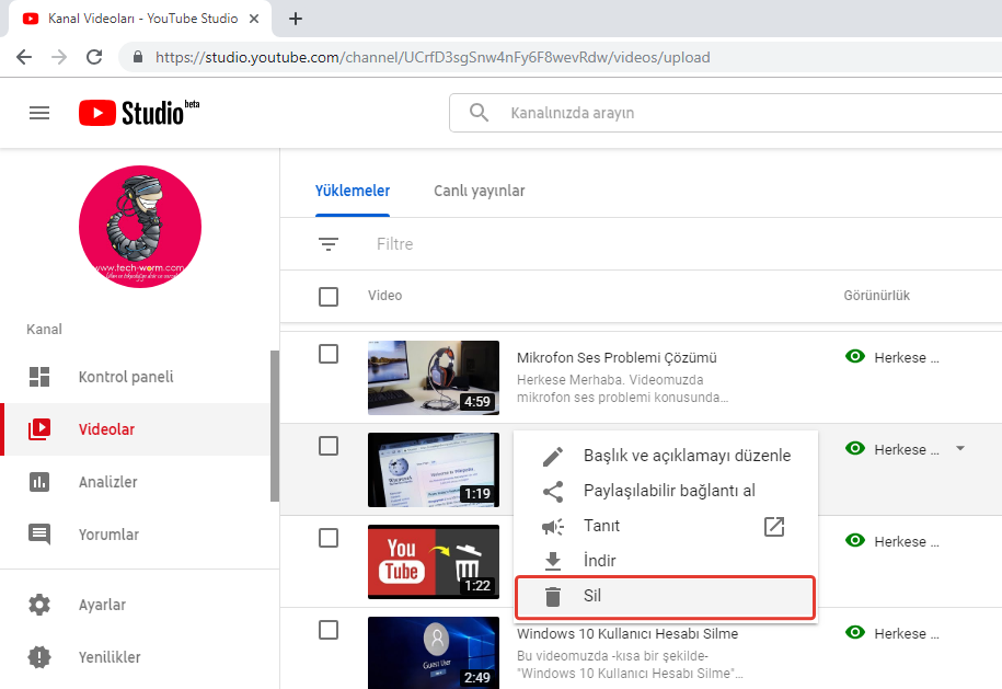 YouTube kanalınıza yüklediğiniz her videoyu aşağıda gösterdiğimiz birkaç adımda silebilirsiniz. Video silme işlemi kalıcıdır; bu işlemden sonra videoyu YouTube üzerinden geri yükleyemezsiniz. Videoyu gelecekte izlemek isterseniz videonun yedeği olduğundan emin olun. Bir videoyu sildikten sonra video URL’si ve başlığı YouTube Analytics içinde gösterilmez veya aratılamaz. İzlenme süresi gibi videoyla ilişkilendirilen veriler, toplu raporlarda yer almaya devam eder ancak silinmiş videoyla ilişkilendirilmez.