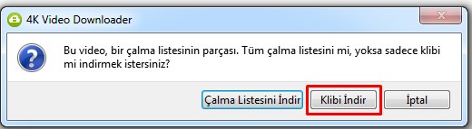 Eğer alttaki gibi bir uyarı çıkarsa klibi indir deyin. Çalma listesi derseniz çalma listesinde ki (videonun sağında bulunan) bütün video veya müzikleri indirir.