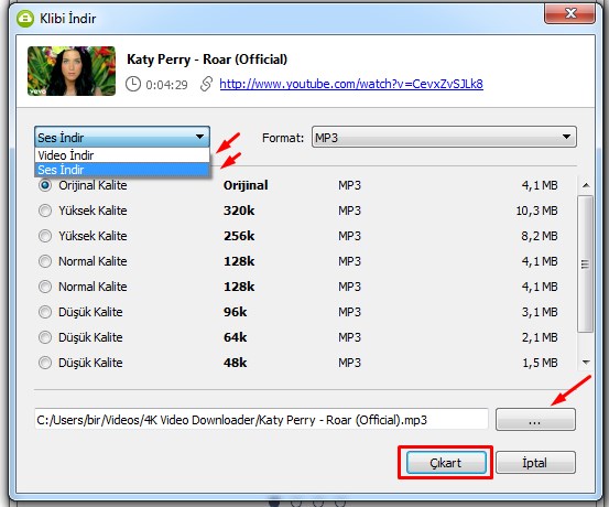 Müzik/Video hazırsa alttaki gibi bir pencere açılacak. Şimdi bu kısımda eğer siz indirmek istediğiniz linkteki dökümanı sadece ses yani video şeklinde izlemeyecek MP3 şeklinde dinleyecekseniz o zaman “Ses İndir” yazan kısmı seçin yok eğer aynı zamanda izleyecekseniz o zaman “Video İndir” kısmı seçeceksniz. Son önemli şey ise eğer müziği/videoyu farklı bir yere indireceksniz … yazan yere klikleyerek bilgisayarın farklı bir yerine indirebilirsiniz aksi hale standart olarak Bilgisayarım içindeki Video kısmına inecektir. İndirme işlemi hazırsa ÇIKART dedikten kısa bir süre sonra bilgisayarınıza inecektir.