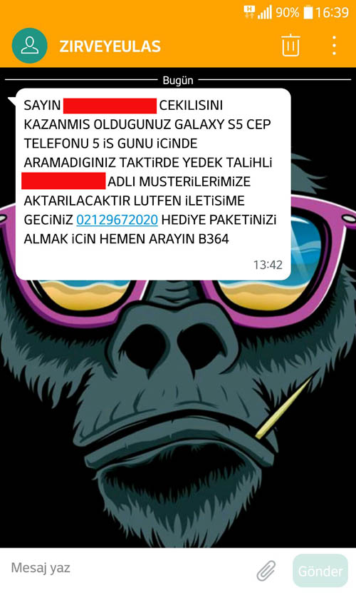 Bana bugün aşağıdaki gibi bir mesaj geldi. “Sayın Falanca Filanca çekilişini kazanmış olduğunuz Galaxy S5 Cep Telefonunu 5 iş günü içinde aramadığınız taktirde yedek talihli Falanca Filanca adlı müşterimize aktarılacaktır. Lütfen iletişime geçiniz 02129672020 hediye paketinizi almak için hemen arayın. B364″